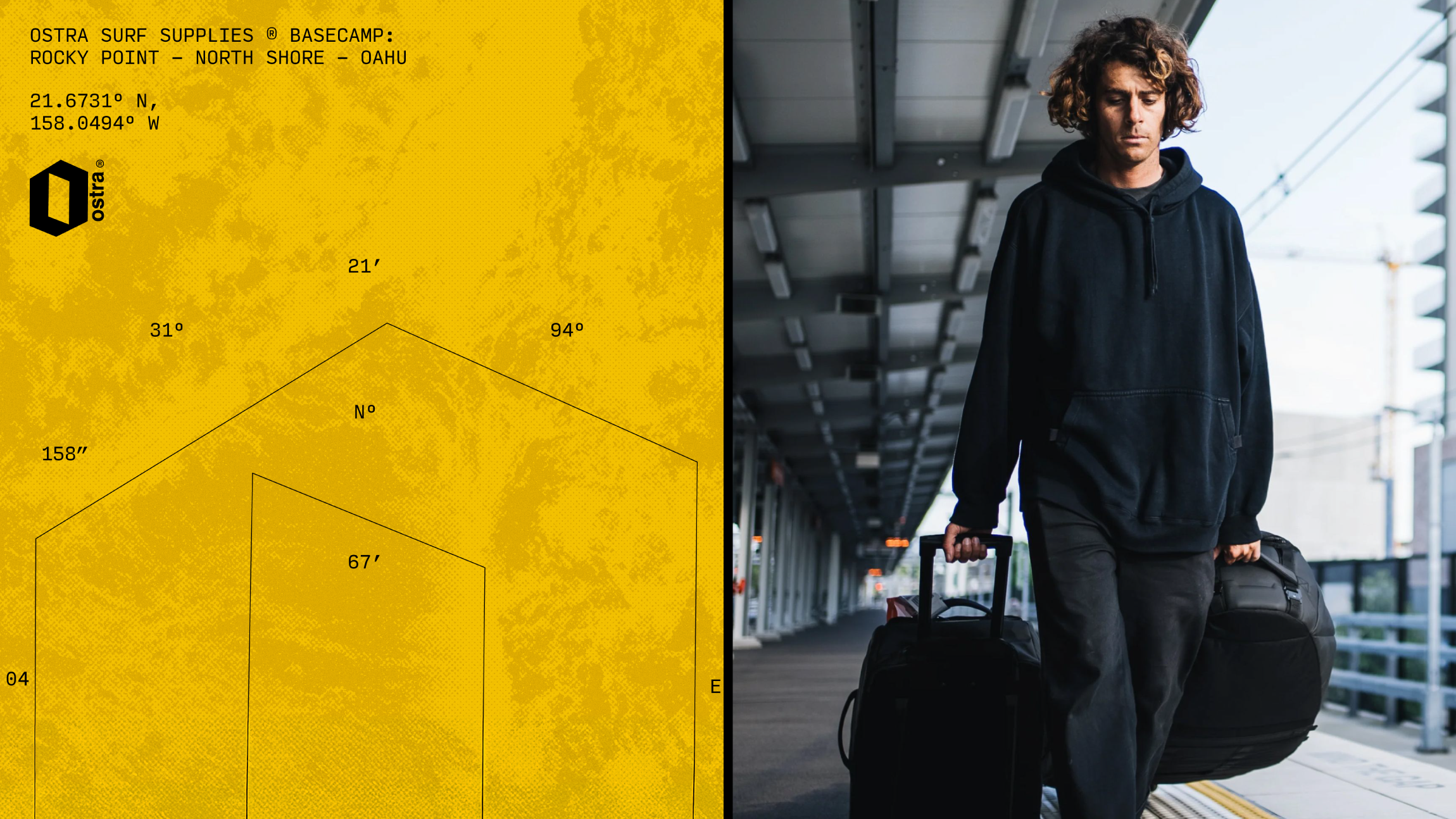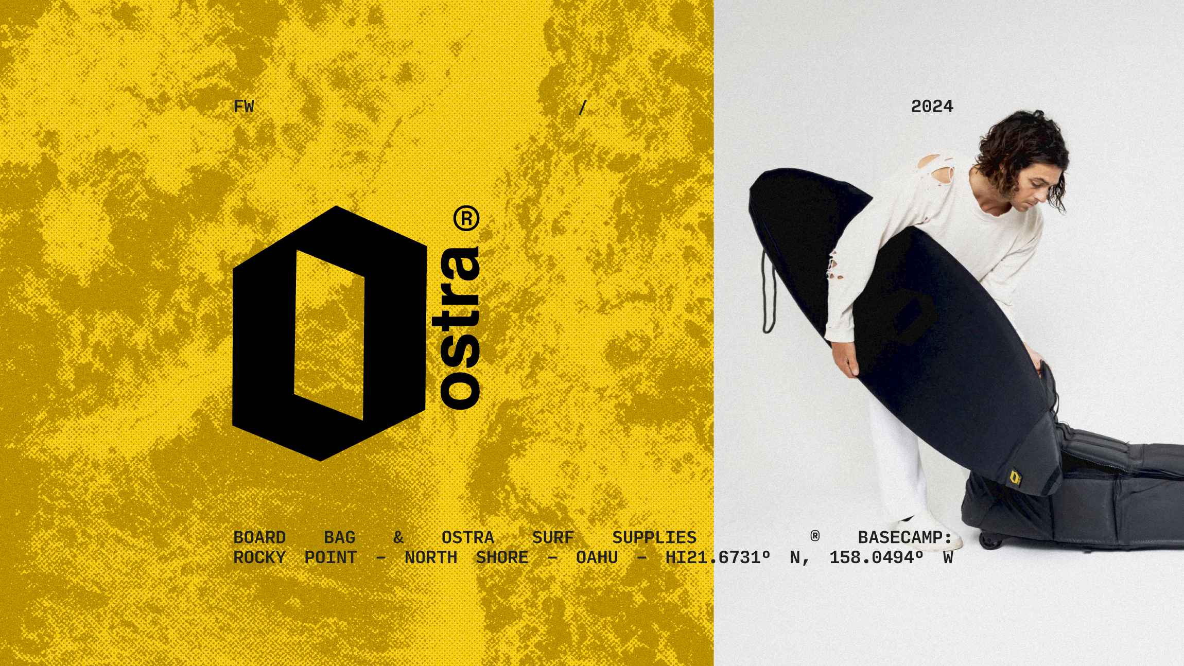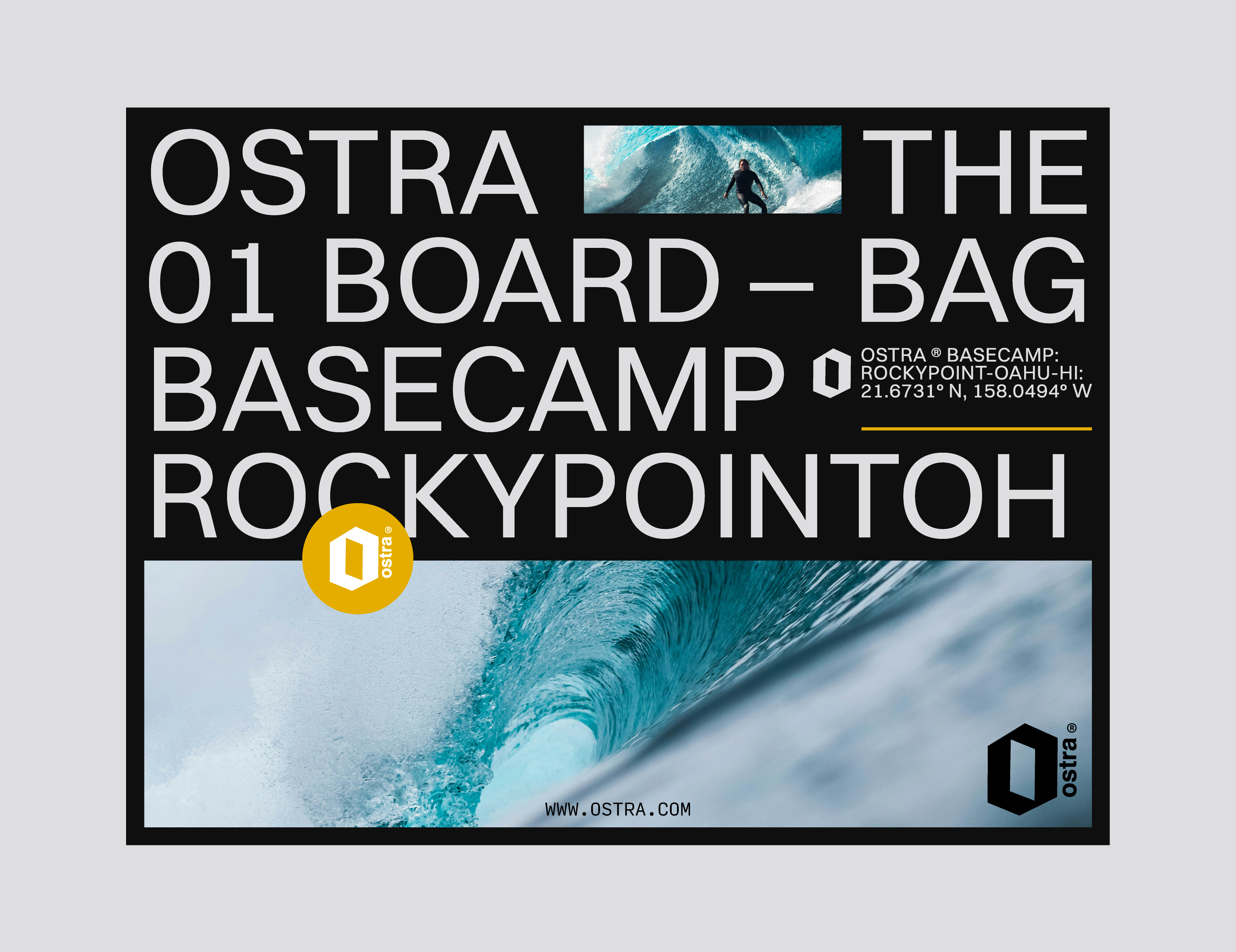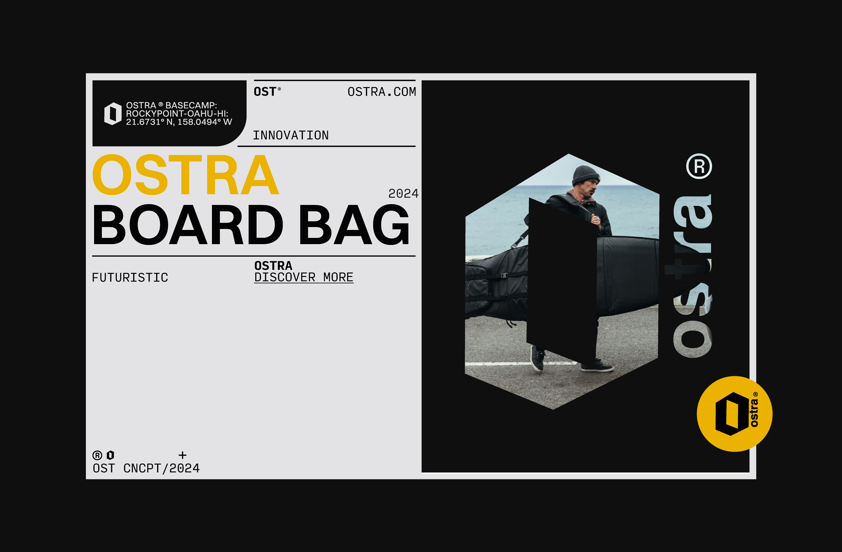 The implementation and prototyping choices were guided by the same navigational and performance driven principles established in the brand foundation. Structured grid systems, oversized typographic hierarchy, coordinate references, and directional markers were applied consistently across packaging, digital layouts, and promotional materials to reinforce clarity and orientation. Mockups and product visuals were treated almost like technical documentation, emphasizing precision, durability, and purpose rather than lifestyle abstraction. This approach ensured that every touchpoint, from web to print, amplified Ostra’s positioning as a travel focused, exploration driven surf brand grounded in movement, direction, and functional design.